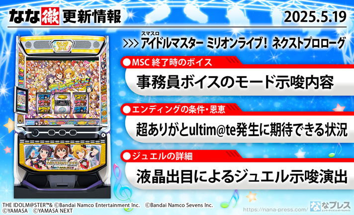 更新情報の概要 今回は通常時の液晶図柄7揃いの恩恵やボーナス終了画面における枠色ごとの設定示唆内容が判明!詳細は下記リンクからチェックしてほしい! 2025年5月26日の更新情報 通常時のゲーム性(ステージ・内部状態・小役による抽選) ・液晶図柄7揃いの恩恵を更新しました ボーナスの種類・特徴 ・ボーナス終了画面の設定示唆内容を更新しました・白枠の示唆内容を新規追加しました・色付き枠画面の示唆内容を新規追加しました THE IDOLM@STER™& ©Bandai Namco Entertainment Inc.©Bandai Namco Sevens Inc. ©YAMASA ©YAMASA NEXT ※なな徹調べ